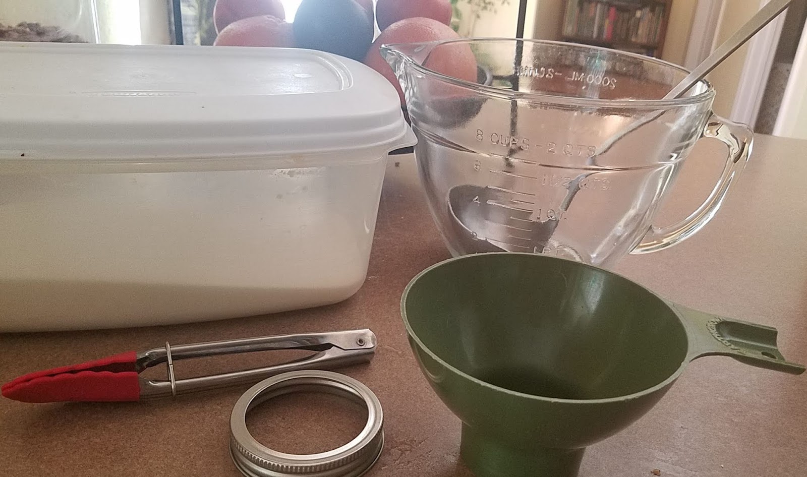 Sanitize nine 8-oz jars and screw rings. I simply add them to a load in the dishwasher and press the "hi-temp wash" button. Place nine new lids in a small saucepan, cover with water, and set on low heat. The lids must be new, or the jars won't seal properly. New jars come with screw rings and lids. If you're using old jars without screw rings, buy a box of new rings/lids. If you have rings, you can get a box of just lids. Target, Wal-Mart, and most supermarkets carry all these supplies, plus pectin, wide-mouth funnels, etc.